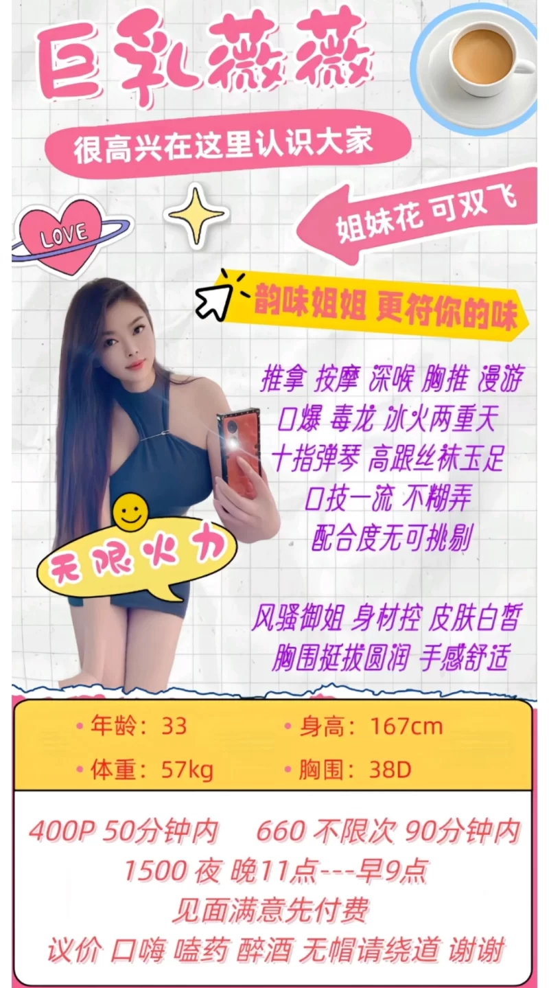 身高一米六,体重大概刚好50kg左右,穿着韵味御姐,但样貌又带点可爱,态度温柔好,热情主动,前后漫游,很认真对待。过程足钟不偷懒的,蛮投入的。可感觉到嘴巴的灵活。后面的时屁股有弹性。配合得合拍。消费大众价5张一次。算是性价比实惠